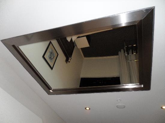 Fixado no teto: este tipo de acabamento oferece bastante perigo, por isso, o vidro utilizado para fazer o espelho deve ser do tipo temperado, conhecido por ser um vidro de segurança. Ele não quebra com facilidade e oferece menor risco de acidentes. Deve-se tomar muito cuidado com a altura do pé direito e o peso do vidro: quanto maior a altura e o peso mais grave podem ser os danos em caso de queda e/ou quebra.