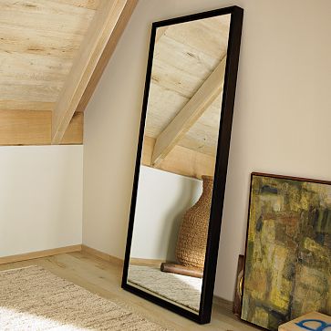 Espelho apoiado no chão: o espelho colocado levemente inclinado é um excelente recurso para que a imagem refletida não seja facilmente visualizada. Isto é, a imagem pode ser jogada para uma área acima ou abaixo da linha dos olhos, assim o espelho pode cumprir seu papel de ampliar e iluminar o espaço sem ser invasivo.